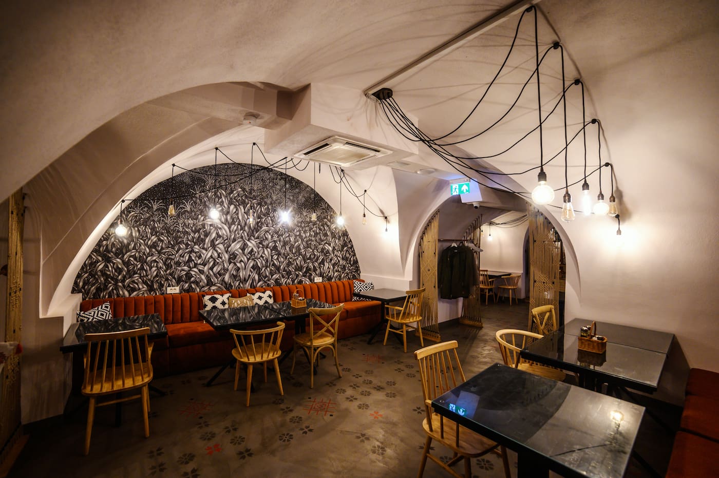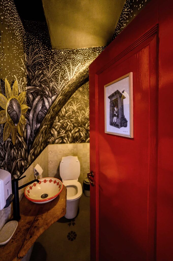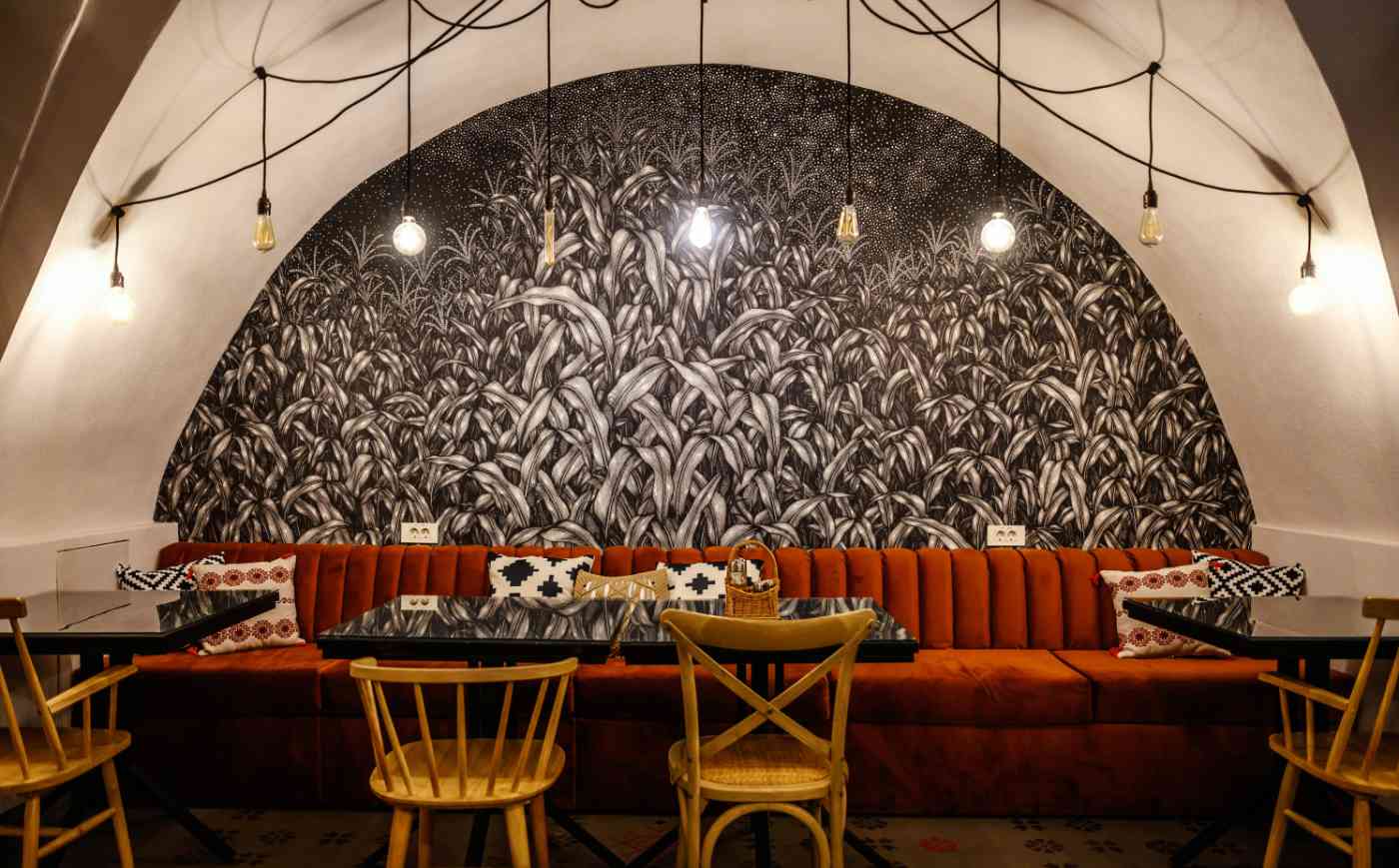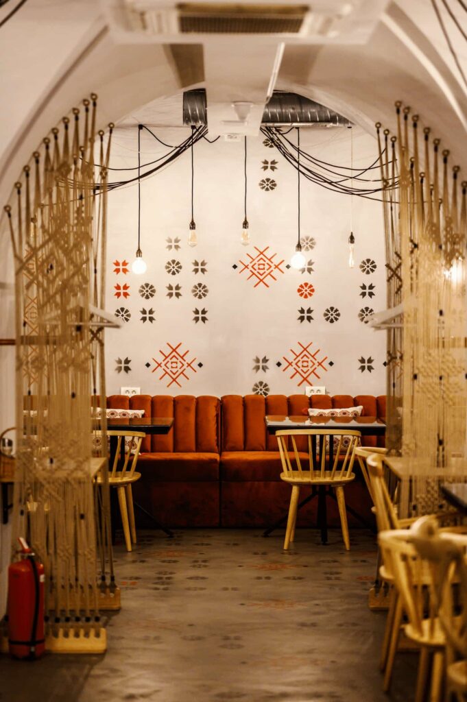 Prin îmbinarea acestor elemente tradiționale cu nevoile unui spațiu modern, am creat un local care onorează spiritul Balcanic și, în același timp, îndeplinește cerințele contemporane. Balkan Bistro a fost gândit ca un spațiu flexibil: mesele de dimensiuni egale pot fi unite sau separate în funcție de necesități, iar iluminatul se poate adapta pentru a crea atmosfera specifică fiecărei situații sau eveniment. Detalii precum cablurile textile și becurile LED retro adaugă o notă de nostalgie, iar elementele unice – cum ar fi tapetul realizat din ilustrațiile desenate de Anca Popa, separatoarele din macramé lucrate manual de Beatrice de la BLoved Decorations sau lavoarele pictate manual – aduc personalitate și transformă spațiul într-un loc memorabil.