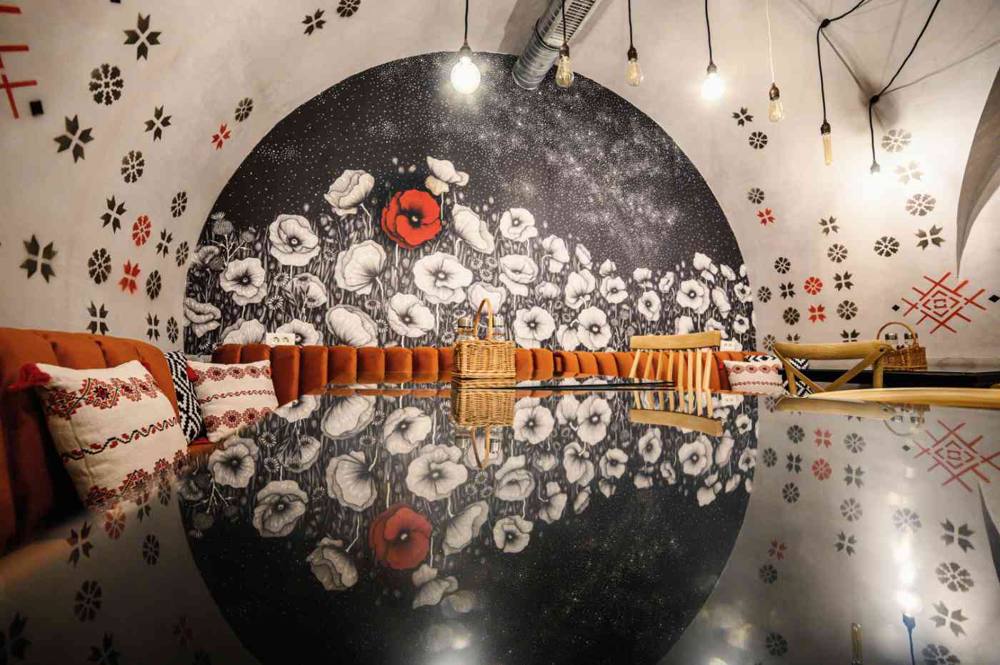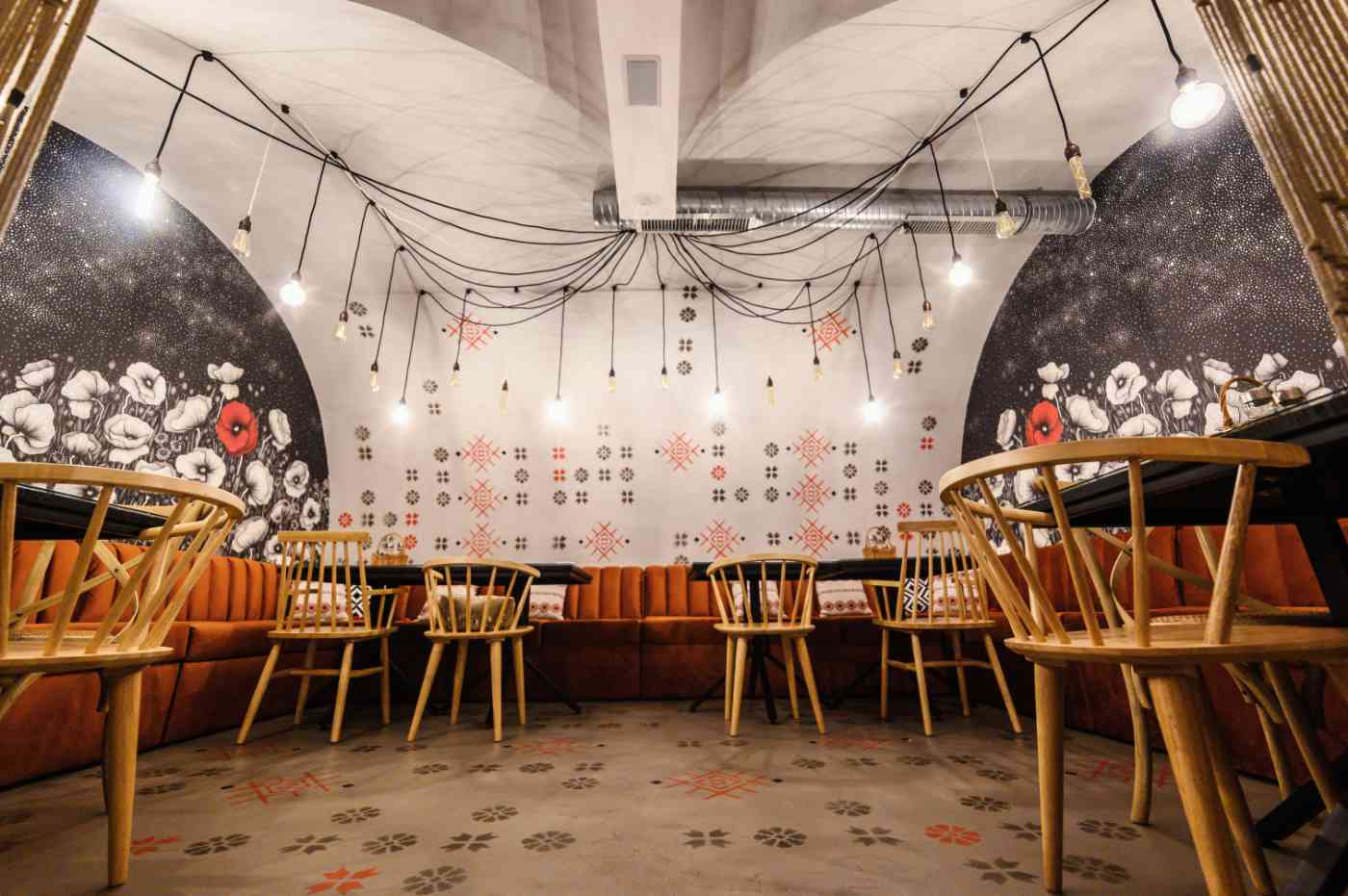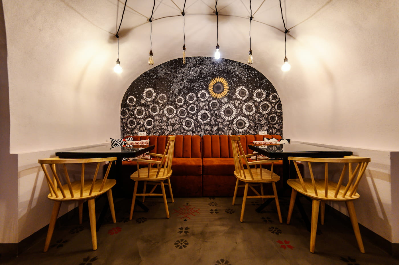 Prin îmbinarea acestor elemente tradiționale cu nevoile unui spațiu modern, am creat un local care onorează spiritul Balcanic și, în același timp, îndeplinește cerințele contemporane. Balkan Bistro a fost gândit ca un spațiu flexibil: mesele de dimensiuni egale pot fi unite sau separate în funcție de necesități, iar iluminatul se poate adapta pentru a crea atmosfera specifică fiecărei situații sau eveniment. Detalii precum cablurile textile și becurile LED retro adaugă o notă de nostalgie, iar elementele unice – cum ar fi tapetul realizat din ilustrațiile desenate de Anca Popa, separatoarele din macramé lucrate manual de Beatrice de la BLoved Decorations sau lavoarele pictate manual – aduc personalitate și transformă spațiul într-un loc memorabil.