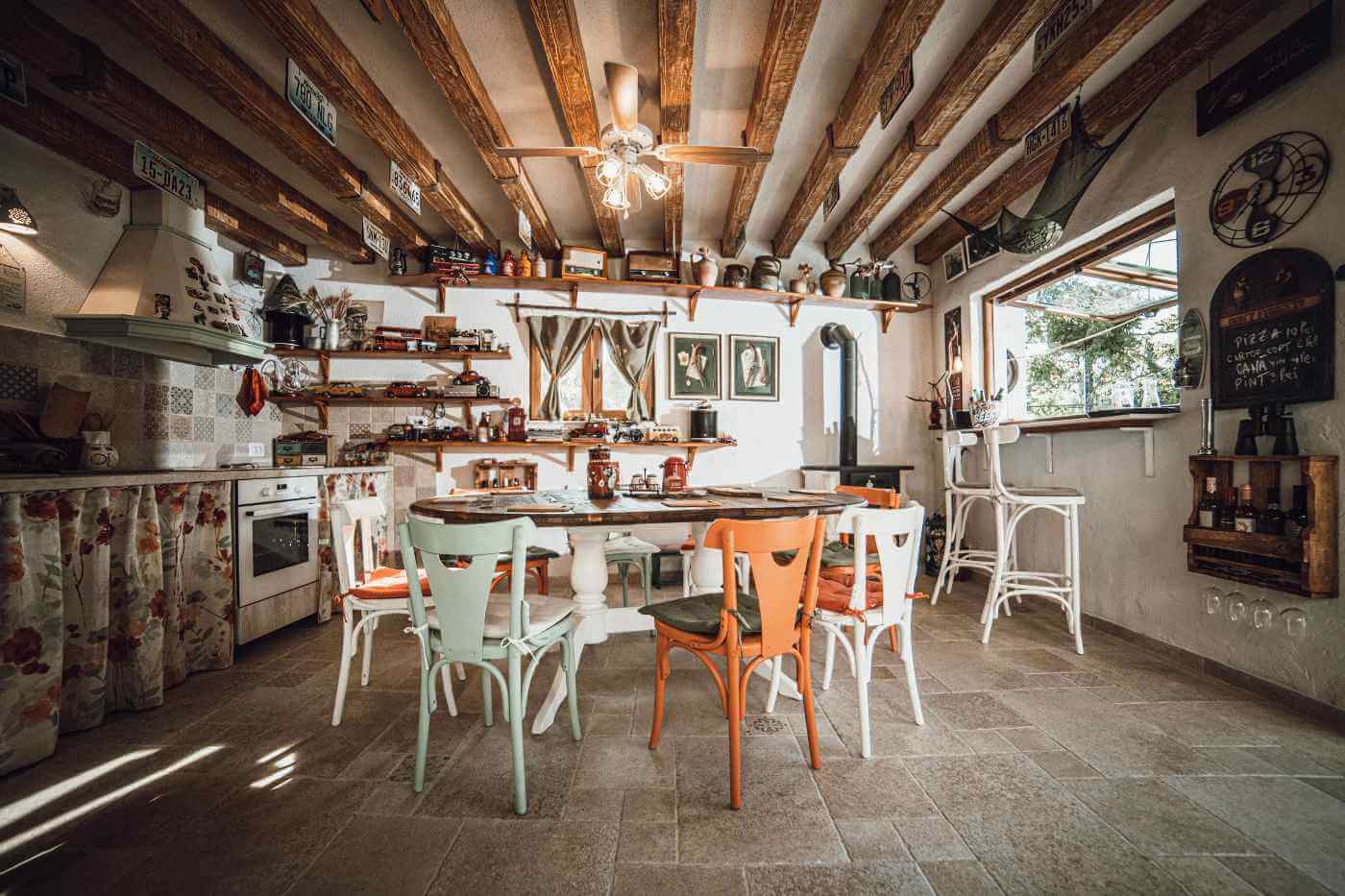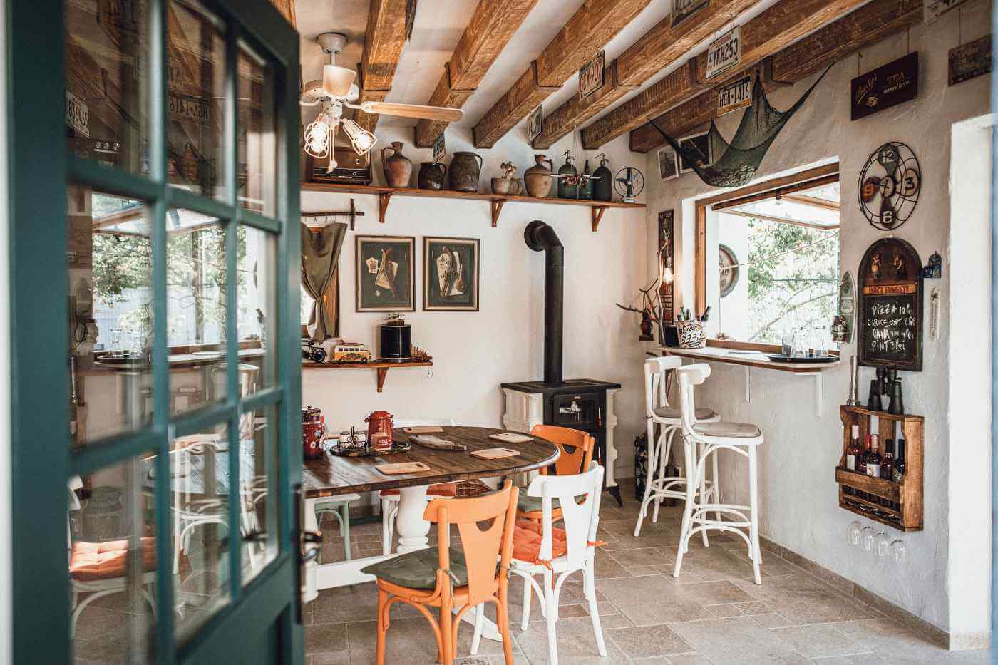 Am început, ca de obicei, cu funcționalitatea. Am aflat că își doreau o bucătărie complet utilată, o zonă generoasă de luat masa, un bar și un colț de relaxare confortabil. Un element esențial al amenajării a fost soba, care oferă nu doar căldură, ci și posibilitatea de a găti delicii pentru serile petrecute alături de familie sau prieteni.