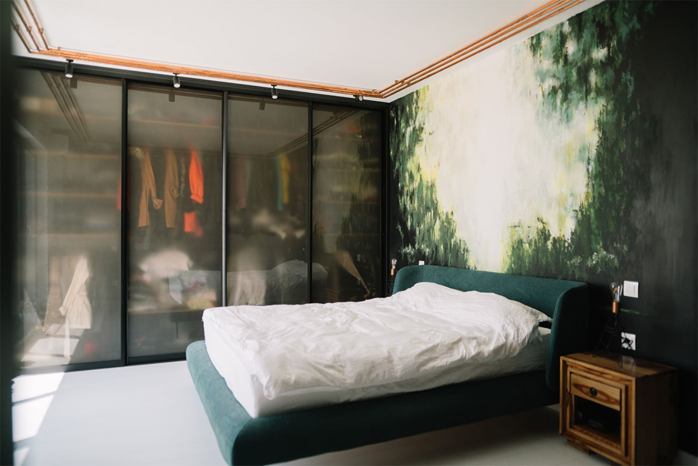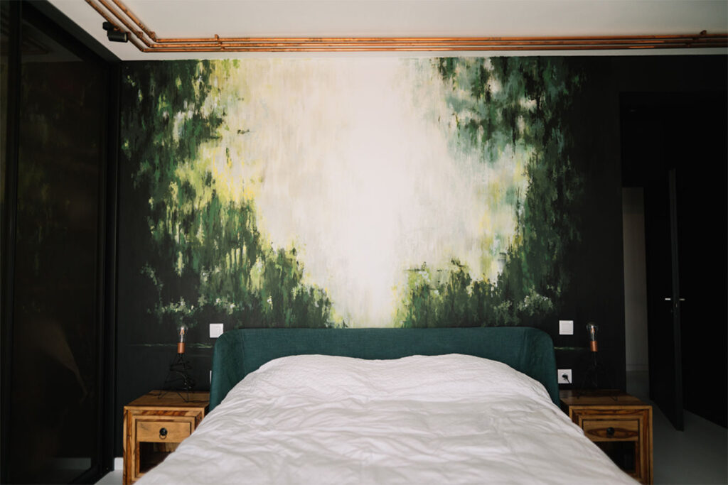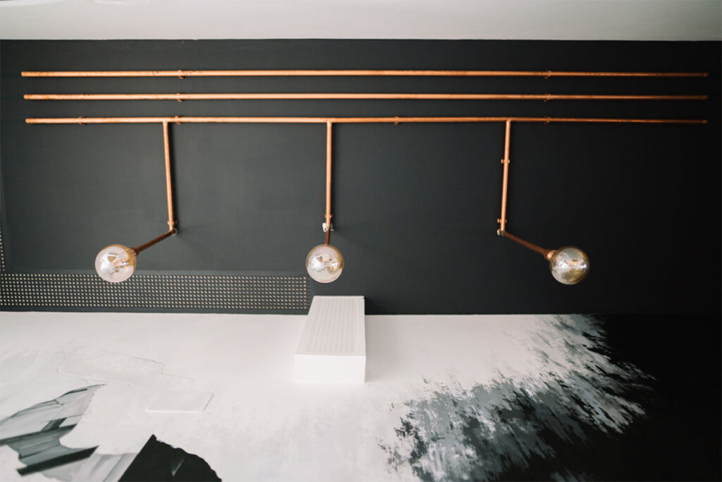 Inspirată de natură, am conturat atmosfera pornind de la ritmurile luminii și umbrelor. Am folosit aceleași finisaje în toate încăperile pentru a da continuitate, cum e parchetul triplu stratificat și cărămida aparentă, o instalație din țevi de cupru și gresie cu aspect industrial în băi și bucătărie. În zona de zi, predomină albul pentru că am dorit să creăm un spațiu foarte luminos, am introdus accente de negru pentru contrast, cupru și lemn pentru căldură și câteva pete de culoare pentru un strop de veselie. În zona de noapte și băi, am vopsit o parte semnificativă din pereți în negru, pentru a crea un efect dramatic și o atmosferă intimă. Holul face tranziția armonioasă între cele două zone principale, iar picturile murale realizate de talentata Doina Vițu adaugă profunzime și personalitate.